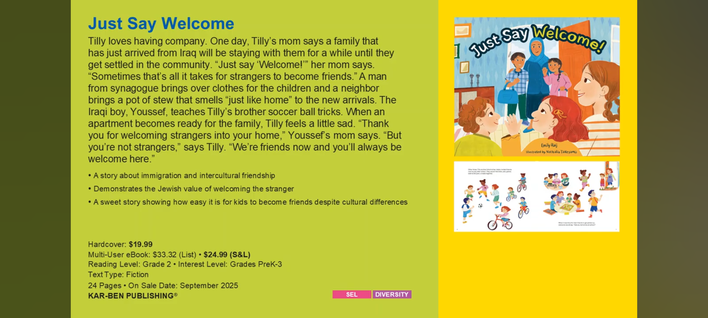 Enjoy this video round-up of Kar-Ben’s new children’s Jewish fiction books for the fall! I’m proud to have Just Say Welcome on the list!