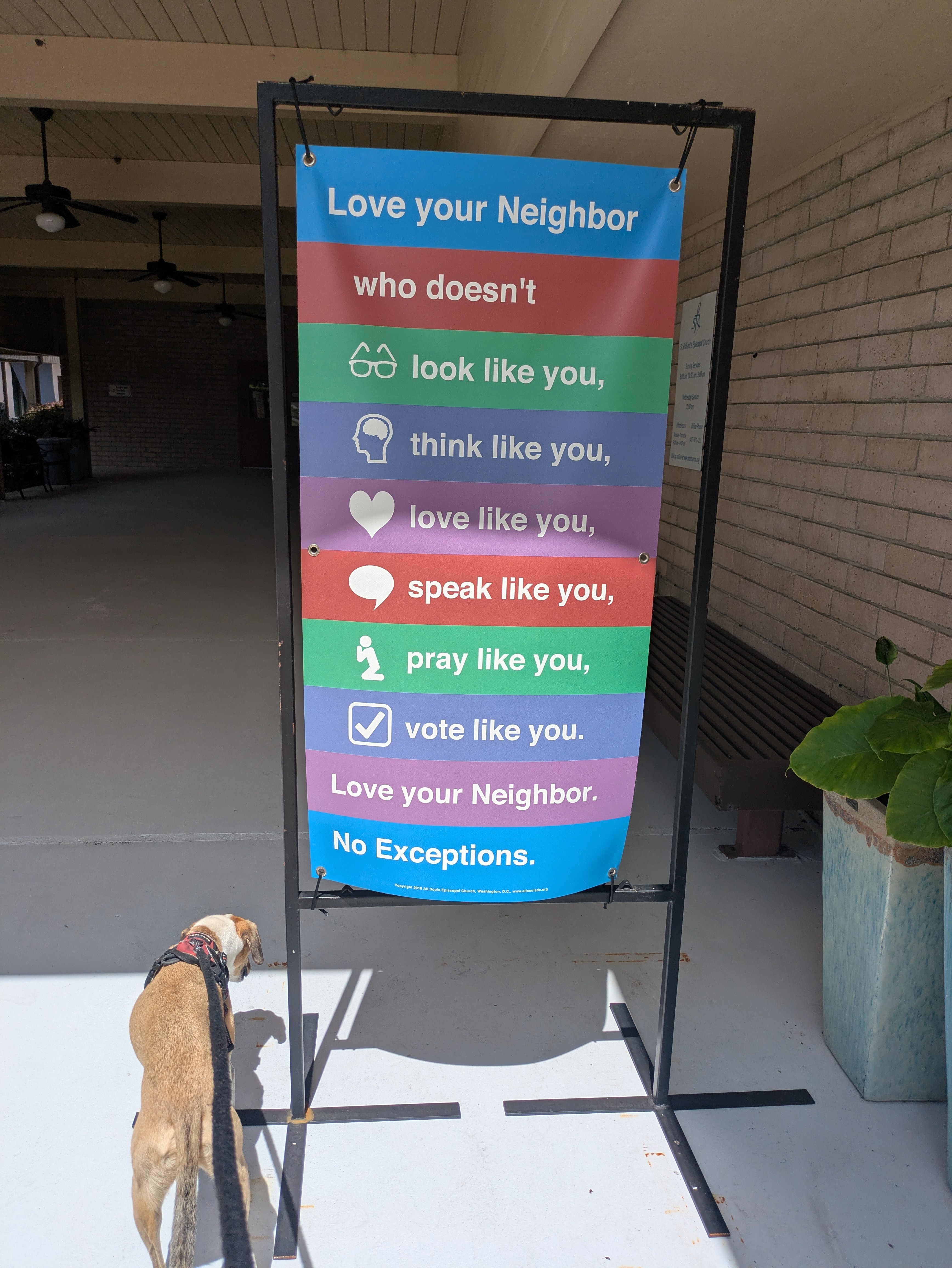 Love Your Neighbor And I love this sign outside a church in my neighborhood. My dog picked up the welcoming scent too. Share this:TweetLike Loading... Related