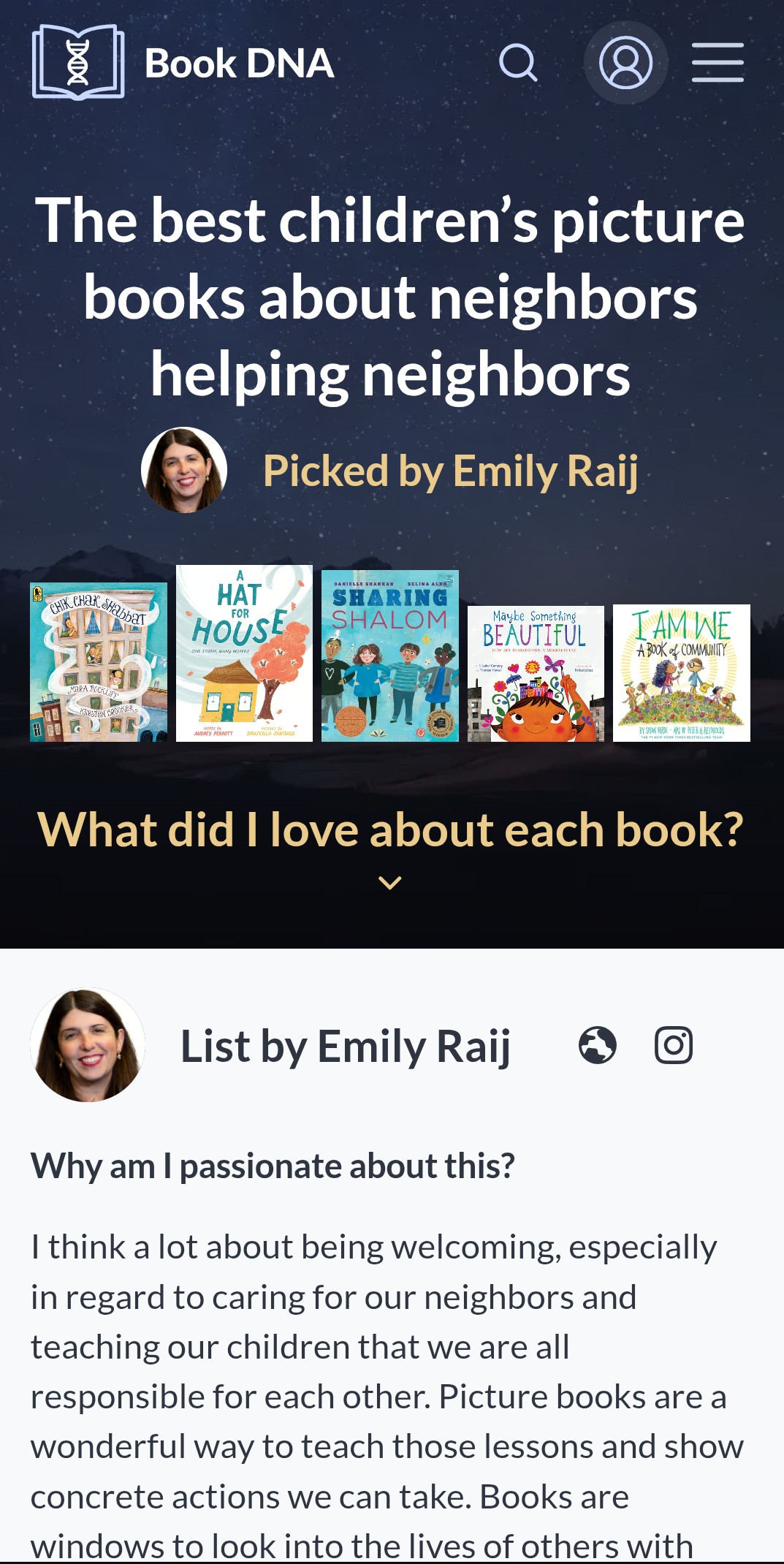 I recently learned about Book DNA (formerly Shepherd.com) on the podcast, Writers with Wrinkles, and thought the platform’s concept was really interesting. Book DNA aims to be a kinder alternative to Goodreads, which some complain has problems with negative review bombing, poor usability, and a lack of authentic interaction and recommendations. On Book DNA, authors and readers curate recommended reading lists around specific topics so that other readers can find their next great read more easily. I decided to give the site a try and created this list of children’s books about neighbors helping neighbors. It was a fun exercise and a great way to think more deeply about books. I also highly recommend the Writers with Wrinkles podcast. Hosts and authors Beth McMullen and Lisa Schmid are honest, funny, smart, and incredibly enjoyable to listen to. They also bring on knowledgeable guests to speak about all things writing and publishing. Happy reading and listening!